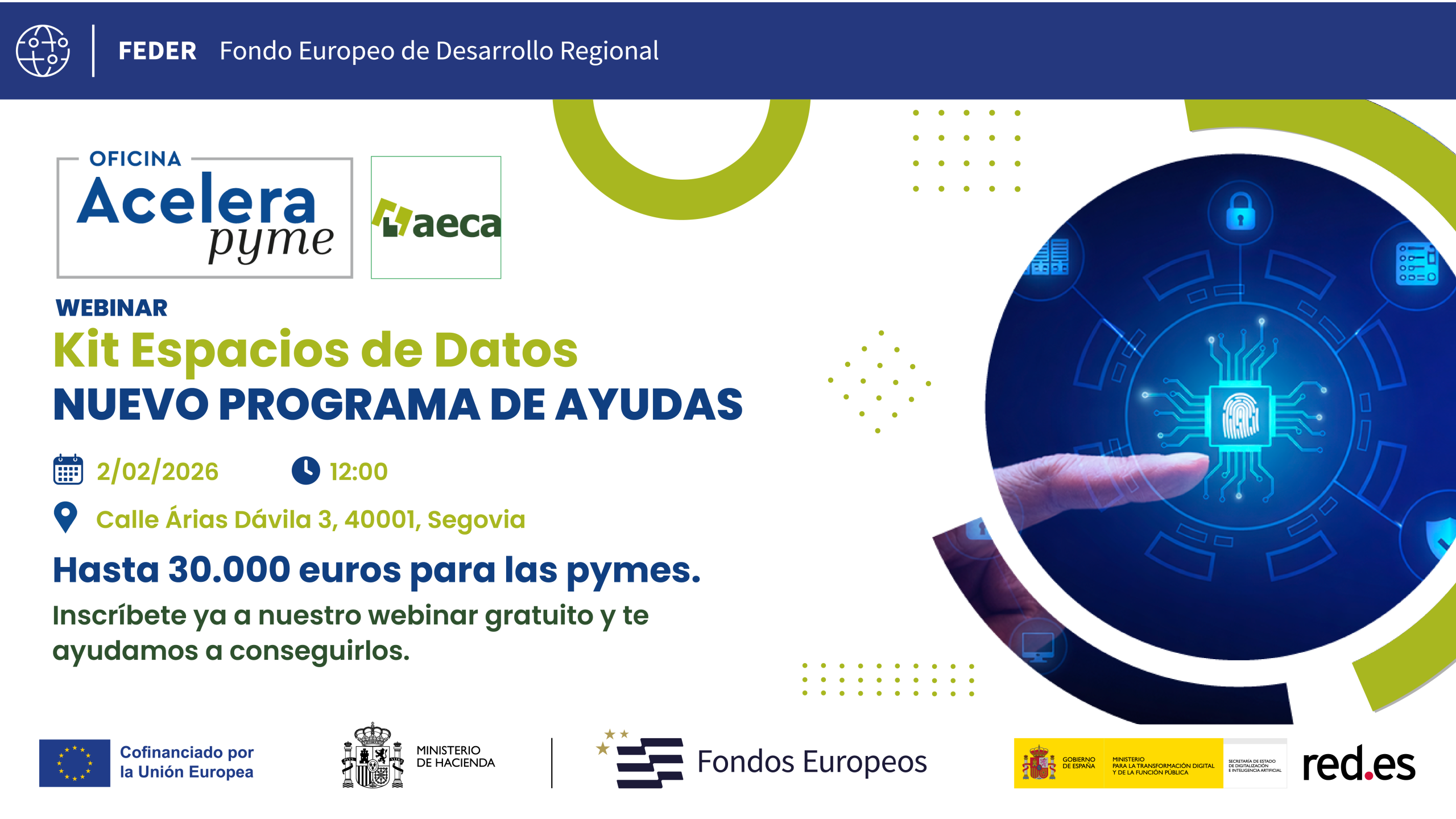 Te invitamos a participar en nuestro webinar, con asistencia presencial u online, donde te explicaremos qué es el Kit Espacios de Datos y cómo tu empresa puede conseguir hasta 30.000 € con esta nueva ayuda a fondo perdido.